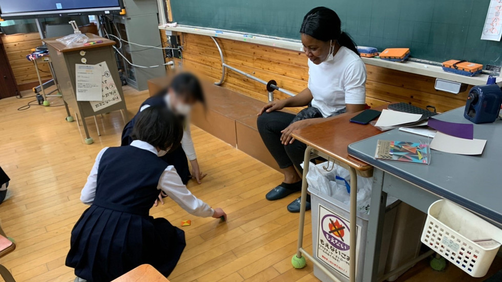 交流の後半では、それぞれの国のお国柄のでるアクティビティが行われました。韓国の研修生は、折り紙で作ったメンコで子どもたちと競い合いました。ナイジェリアの研修生は日本でもなじみのフルーツバスケットで大盛り上がりとなりました。フィリピンから来た研修生は、「heb,heb」「hurray」という二週類の動きを間違えることなくチームでポーズするゲームで大盛り上がり。